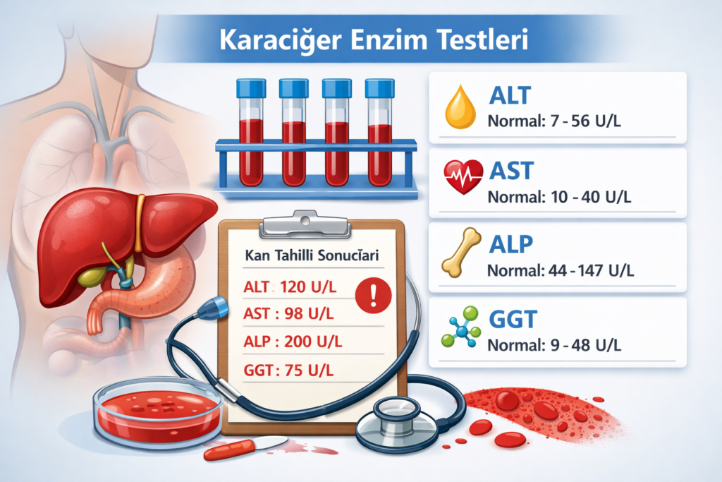- GGT (Gamma-Glutamil Transferaz): Safra kanalı işlev bozukluğunda yükselir ve genellikle alkol tüketimiyle bağlantılıdır.