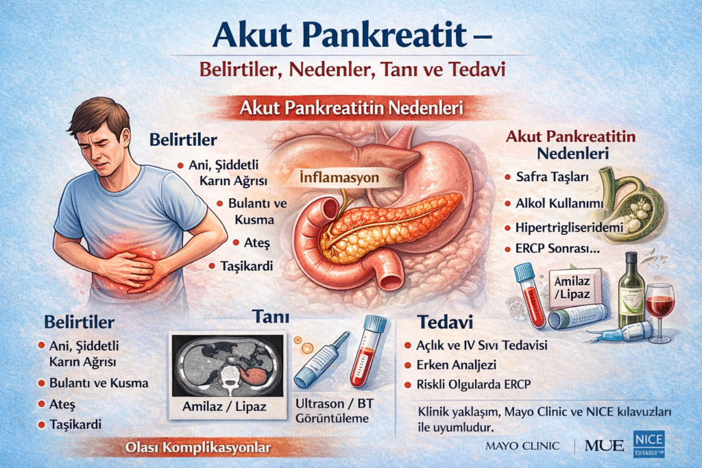 Akut pankreatit acil servislerde sık karşılaşılan ve zamanında müdahale edilmediğinde hayatı tehdit edebilen bir hastalıktır. Erken tanı, doğru risk sınıflaması ve uygun tedavi ile mortalite önemli ölçüde azaltılabilir.
