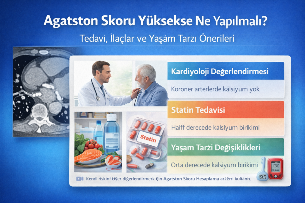 Özellikle Agatston skoru 100’ün üzerinde olan bireylerde, ek risk faktörleri varlığında statin tedavisi sıklıkla önerilir. Tedavi kararı mutlaka hekim tarafından, bireysel risk profiline göre verilmelidir.
